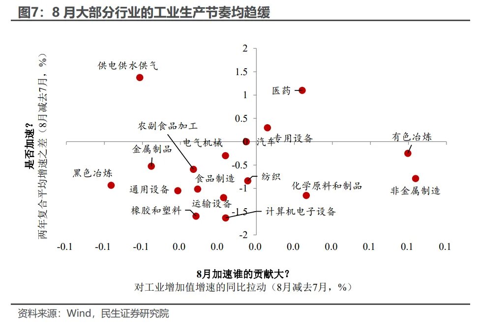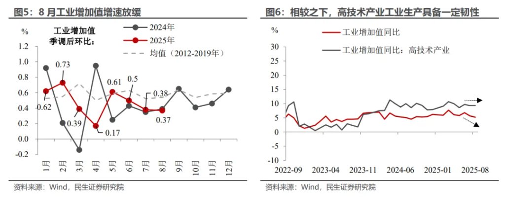 整体来看,“反内卷”与“稳外贸”压力将继续压制企业生产意愿。除了“反内卷”政策推动供给侧结构优化、压制企业生产扩张意愿之外,8月出口增速的回落表明,企业在高关税下面临的“稳外贸”压力也使其对扩产持谨慎观望态度。在这一背景下,我们预计短期内工业增加值增速将稳中趋缓。