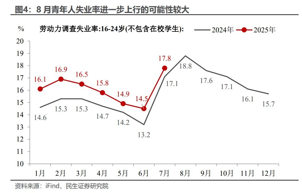 最后,8月城镇调查失业率的上升意味青年人失业压力显现。8月城镇调查失业继续遵循着三季度上升的季节性模式,鉴于今年1222万高校毕业生规模高于去年(1179万),那么2-3天后公布的16-24岁青年人失业率,或将进一步显现出当前劳动力市场的就业压力。