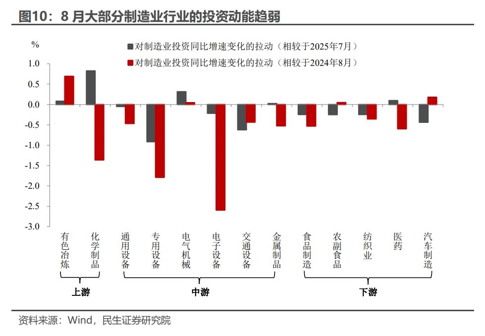 从不同行业来看,相较于7月,8月大多数行业制造业投资动能均在减弱(尤其是中下游行业),其中专用设备、交通设备、汽车制造等行业投资放缓趋势明显。