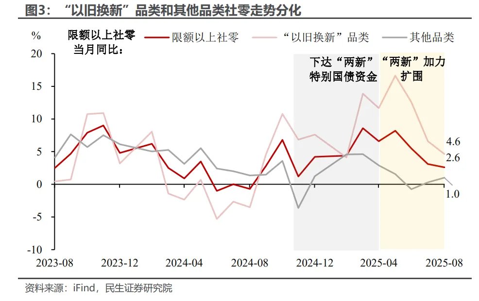其次,“以旧换新”政策效应衰减信号进一步显现。8月社零增速靠的是“以旧换新”之外的商品的“加持”,反观大部分“以旧换新”品类却对社零整体形成拖累。随着“国补”资金进入尾声,增量消费政策的布局已经“箭在弦上”。