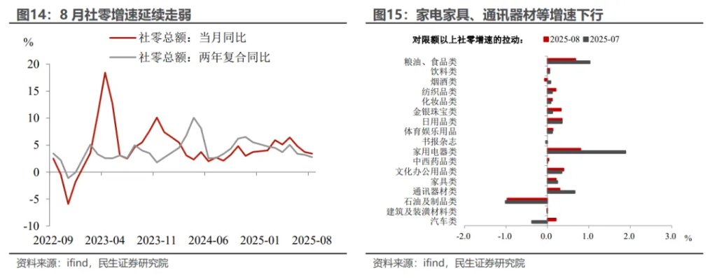 消费:“以旧换新”补贴边际效应减弱,拖累消费增长。7月社零增速延续下行至3.4%,其中“国补”资金的消耗以及近期部分地区补贴的暂停使得“以旧换新”政策效应的拉动减弱,而前期补贴也使得需求部分前置,对后续增长形成透支。家电、家具、通讯器材等“加力扩围”产品增速均有所回落,但汽车消费边际回暖。