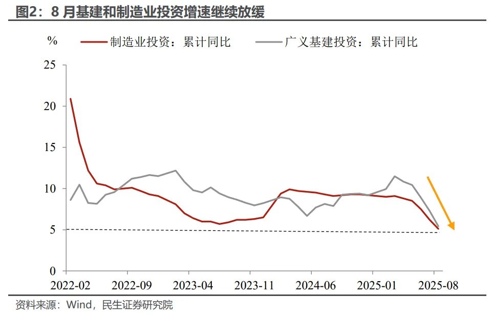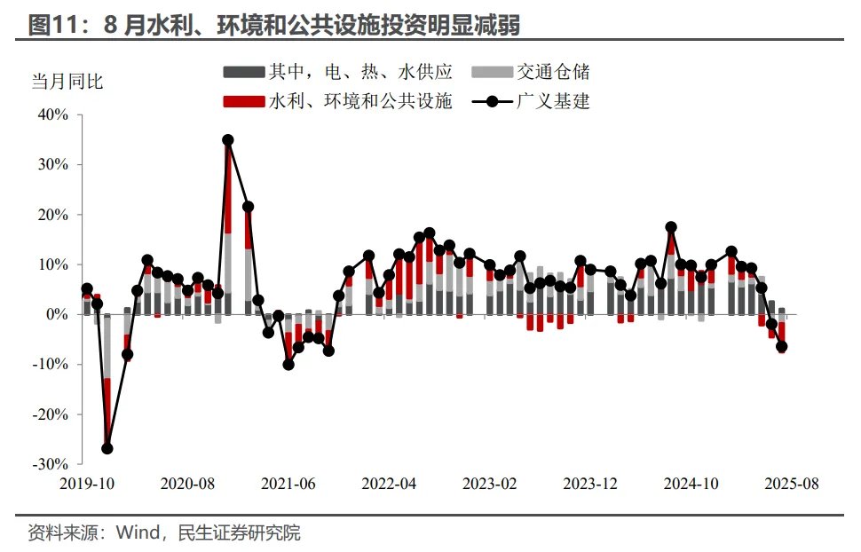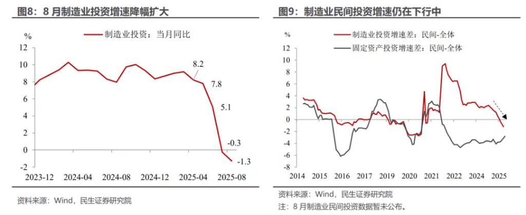 制造业:企业投资动能偏弱。自4月美国加征关税以来,制造业投资同比增速便处于下行通道,8月降幅从7月的-0.3%进一步扩大至-1.3%。结合制造业民间投资活跃度下滑的态势来看,当前影响制造业投资增速的核心因素在于预期修复与信心恢复力度不足,无论是内部的“反内卷”、还是外部的贸易风波,短期内都会对企业投资动能形成压制。