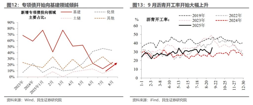 然而,放眼投资端,基建的下行压力相对可控。核心原因在于,基建投资与私营企业紧密度相对更低,修复动能相对更足。今年特殊新增专项债额度见底,当前专项债投向基建的占比重拾抬升。同时结合高频的沥青开工率来看,在夏季高温影响逐步散去后,9月沥青开工率大幅上升,基建领域正在释放边际改善的积极信号。